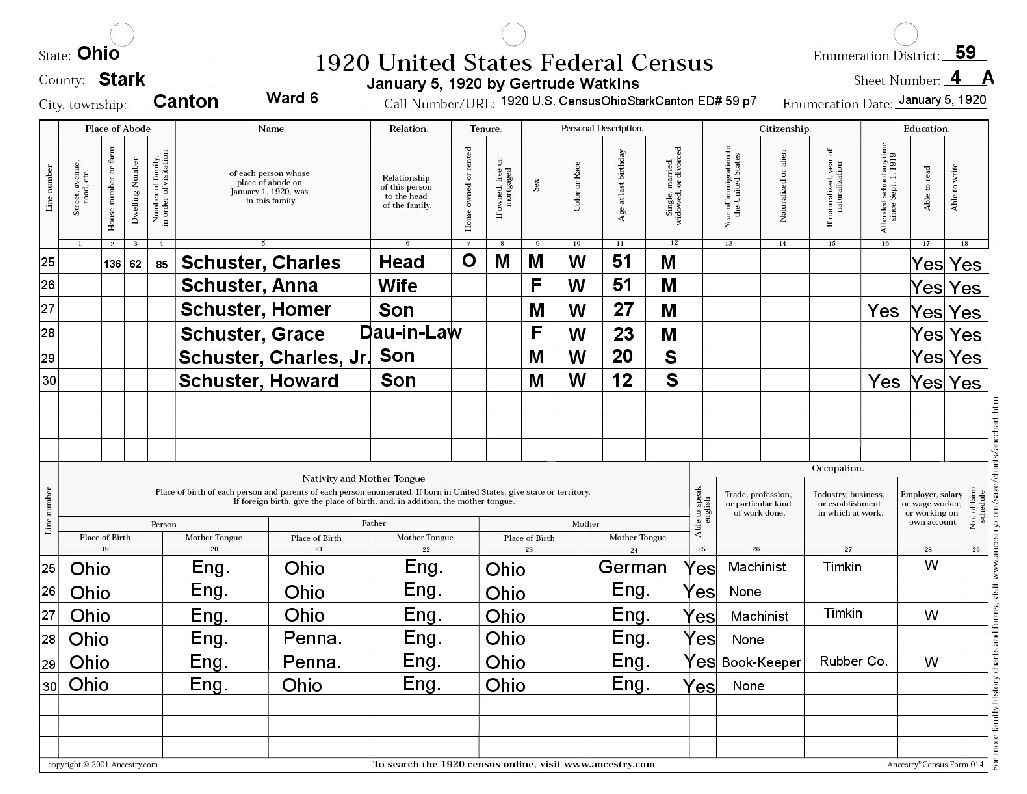 - Schuster, Charles, 1920 Census submitted by Diana Gosnell